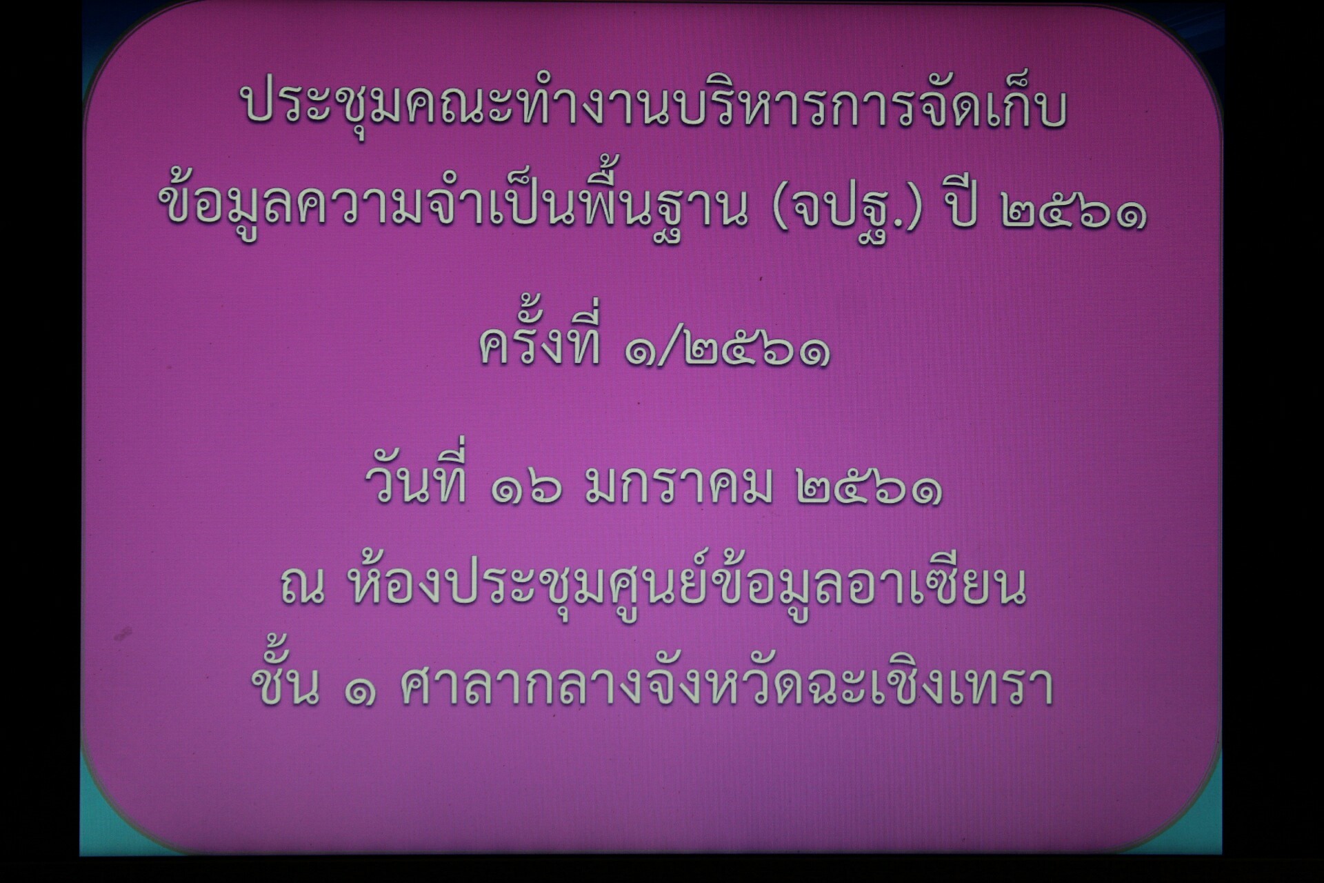 สำนักงานพัฒนาชุมชนกำหนดประชุมคณะทำงานบริหารการจัดเก็บข้อมูลความจำเป็นพื้นฐาน (จปฐ.) ปี 2561 โดยมีนายกิตติพันธุ์ โรจนชีวะ รองผู้ว่าราชการจังหวัดฉะเชิงเทรา เป็นประธาน พร้อมด้วยส่วนราชการคณะทำงานฯ เข้าร่วมประชุมโดยพร้อมเพรี้ยง เมื่อวันที่ 16 มกราคม 2561 ณ ห้องประชุมศูนย์ข้อมูลอาเซียน ชั้น 1 ศาลากลางจังหวัดฉะเชิงเทรา