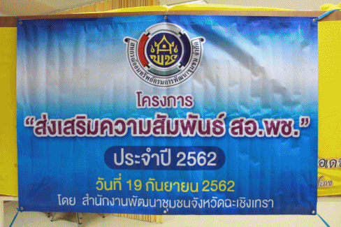 นางสาวฉัตรประอร นิยม พัฒนาการจังหวัดฉะเชิงเทรา มอบหมายให้ นายชูชาติ เอี่ยมวิจิตร์ ผู้แทน สอ.พช.ฉะเชิงเทรา ประชุมสมาชิก สอ.พช.ตามโครงการส่งเสริมความสัมพันธ์ สอ.พช.ประจำปี ๒๕๖๒ เพื่อชี้แจงผลการดำเนินงานของ สอ.พช. การบริหารจัดการการบริการของ สอ.พช. การคัดเลือกตัวแทน สอ.พช.ที่ครบวาระ จำนวน ๒ คน การจัดกิจกรรมแข่งขันกีฬา กิจกรรมสงเคราะห์เลี้ยงอาหารคนพิการ และกิจรรมเสริมสร้างความสัมพันธ์สมาชิก สอ.พช. ประจำปี ๒๕๖๒ ซึ่งมีสมาชิก สอ.พช.จังหวัดฉะเชิงเทรา เข้าร่วมกิจกรรมประมาณ ๗๐ คน.