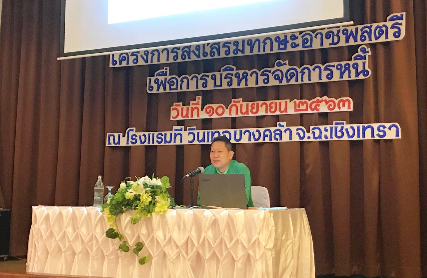 ??ภายในกิจกรรมครั้งนี้ ได้รับเกียรติจากนายพินิจ พินพาทย์ พนักงานบริหารจัดการหนี้ สำนักงาน ธ.ก.ส.จังหวัดฉะเชิงเทรา บรรยายให้ความรู้เกี่ยวกับเทคนิคการบริหารจัดการหนี้ที่มีประสิทธิภาพและการจัดทำแผนการลดมูลค่าหนี้ค้างชำระกองทุนพัฒนาบทบาทสตรี การเล่าประสบการณ์จากผู้แทนกลุ่มอาชีพสมาชิกกองทุนพัฒนาบทบาทสตรีดีเด่นระดับจังหวัดฉะเชิงเทรา น.ส.กรรณฏา หมื่นอนันต์ ในการกู้เงินทุนหมุนเวียนกองทุนพัฒนาบทบาทสตรี ประกอบอาชีพกลุ่มแปรรูปอาหารประสบผลสำเร็จ และต่อยอดสินค้าเป็นผลิตภัณฑ์ OTOP หลังจากนั้นได้มีการฝึกอาชีพตามฐานเรียนรู้ปรัชญาของเศรษฐกิจพอเพียง จำนวน 5 ฐาน ได้แก่ การทำไม้กวาดดอกหญ้า การทำสบู่ การทำขนมตะโก้ การทำหมูสะเต๊ะ และการทำน้ำพริกปลากะพง เพื่อเป็นการสร้างอาชีพ สร้างรายได้ ให้กับกลุ่มเป้าหมายในการประกอบอาชีพต่อไป