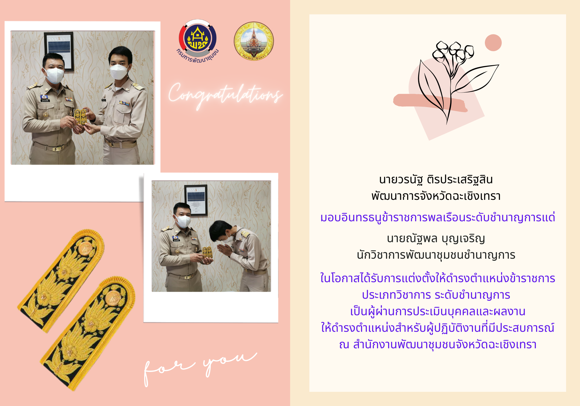 นายวรนัฐ ติรประเสริฐสิน พัฒนาการจังหวัดฉะเชิงเทรา มอบอินทรธนูข้าราชการพลเรือนระดับชำนาญการแด่นายณัฐพล บุญเจริญ นักวิชาการพัฒนาชุมชนชำนาญการ ในโอกาสได้รับการแต่งตั้งให้ดำรงตำแหน่งข้าราชการ ประเภทวิชาการ ระดับชำนาญการ เป็นผู้ผ่านการประเมินบุคคลและผลงานให้ดำรงตำแหน่งสำหรับผู้ปฏิบัติงานที่มีประสบการณ์ ณ สำนักงานพัฒนาชุมชนจังหวัดฉะเชิงเทรา