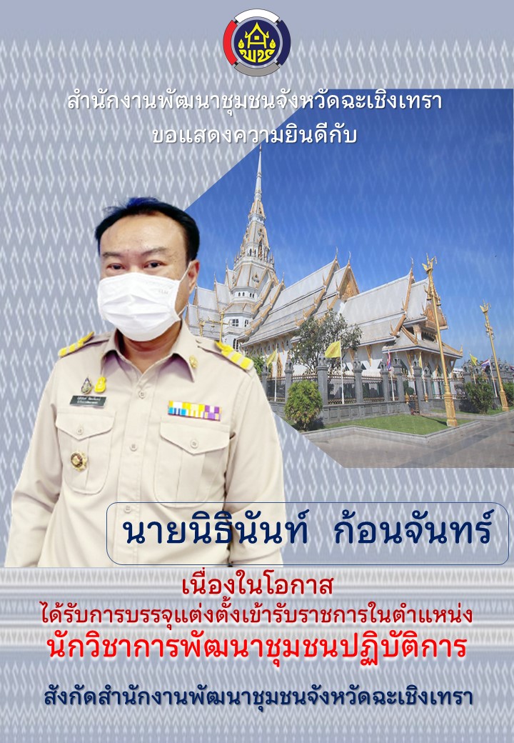 สำนักงานพัฒนาชุมชนจังหวัดฉะเชิงเทรา ขอแสดงความยินดี กับ นายนิธินันท์ ก้อนจันทร์ นักวิชาการพัฒนาชุมชนปฏิบัติการ