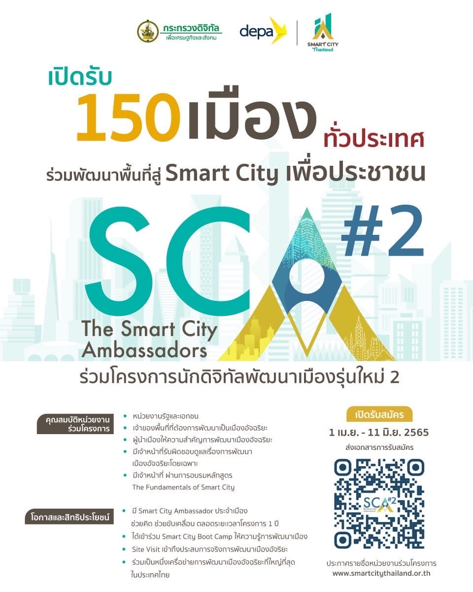รับสมัครเข้าร่วมโครงการนักดิจิทัลพัฒนาเมืองรุ่นใหม่ รุ่นที่ 2 (The smart City Ambassadors 2 (SCA#2)) เพื่อสนับสนุนการพัฒนาเมืองอัจฉริยะ โดยการยกระดับความรู้และสร้างทักษะด้านการพัฒนาเมืองอัจฉริยะ ให้แก่บุคลากร นิสิตและนักศึกษาจบใหม่ หรือผู้ที่ต้องการเข้าร่วมเพื่อขับเคลื่อนการพัฒนาเมือง โดยหน่วยงานที่เข้าร่วมโครงการ บุคลากรในหน่วยงานจะได้เข้าร่วมกิจกรรมยกระดับและพัฒนาทักษะด้านการพัฒนาเมืองอัจฉริยะร่วมกับเมืองอื่นๆ ที่เข้าร่วมโครงการ รวมระยะเวลาโครงการ 12 เดือน