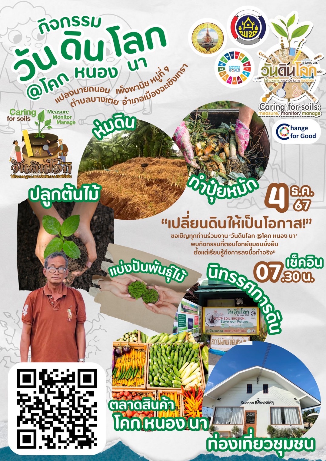 ✨นายปัณณธร ล่ามแขก พัฒนาการจังหวัดฉะเชิงเทรา มอบหมายให้นายยืนยง ขาวงาม นักวิชาการพัฒนาชุมชนชำนาญการ พร้อมด้วยนางสาวเอมอร มานะวะ นักวิชาการพัฒนาชุมชนชำนาญการ ร่วมกับนางสาวิตรี ประดิษแจ้ง พัฒนาการอำเภอเมืองฉะเชิงเทรา เจ้าหน้าที่พัฒนาชุมชนอำเภอเมืองฉะเชิงเทรา กำนัน ผู้ใหญ่บ้าน และภาคีเครือข่ายในพื้นที่ตำบลบางเตย เตรียมความพร้อมการจัดกิจกรรมวันดินโลก ประจำปีงบประมาณ พ.ศ. 2568 (World Soil Day) ประจำปี 2567 ภายใต้หัวข้อ “Caring for soils: measure, monitor, manage” “ใส่ใจมาตรฐาน ตรวจวัดจัดการ ดินดียั่งยืน” ในวันพุธที่ 4 ธันวาคม 2567 ณ พื้นที่ดำเนินการ โคก หนอง นา แปลงนายถนอม เพ็งพานิช หมู่ที่ 9 ตำบลบางเตย อำเภอเมืองฉะเชิงเทรา จังหวัดฉะเชิงเทรา ซึ่งภายในมีงานกิจกรรมดังนี้