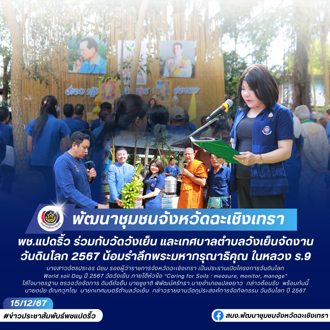 พช.ฉะเชิงเทรา ร่วมกับ วัดวังเย็นและเทศบาลตำบลวังเย็น ดำเนินโครงการวันดินโลก World soil Day ปี 2567 วัดวังเย็น ภายใต้หัวข้อ “Caring for Soils : measure, monitor, manage” ใส่ใจมาตรฐาน ตรวจวัดจัดการ ดินดียั่งยืน เพื่อน้อมรำลึกถึงพระมหากรุณาธิคุณและถวายสดุดีพระเกียรติคุณพระบาทสมเด็จพระบรมชนกาธิเบศร มหาภูมิพลอดุลยเดชมหาราช บรมนาถบพิตร
