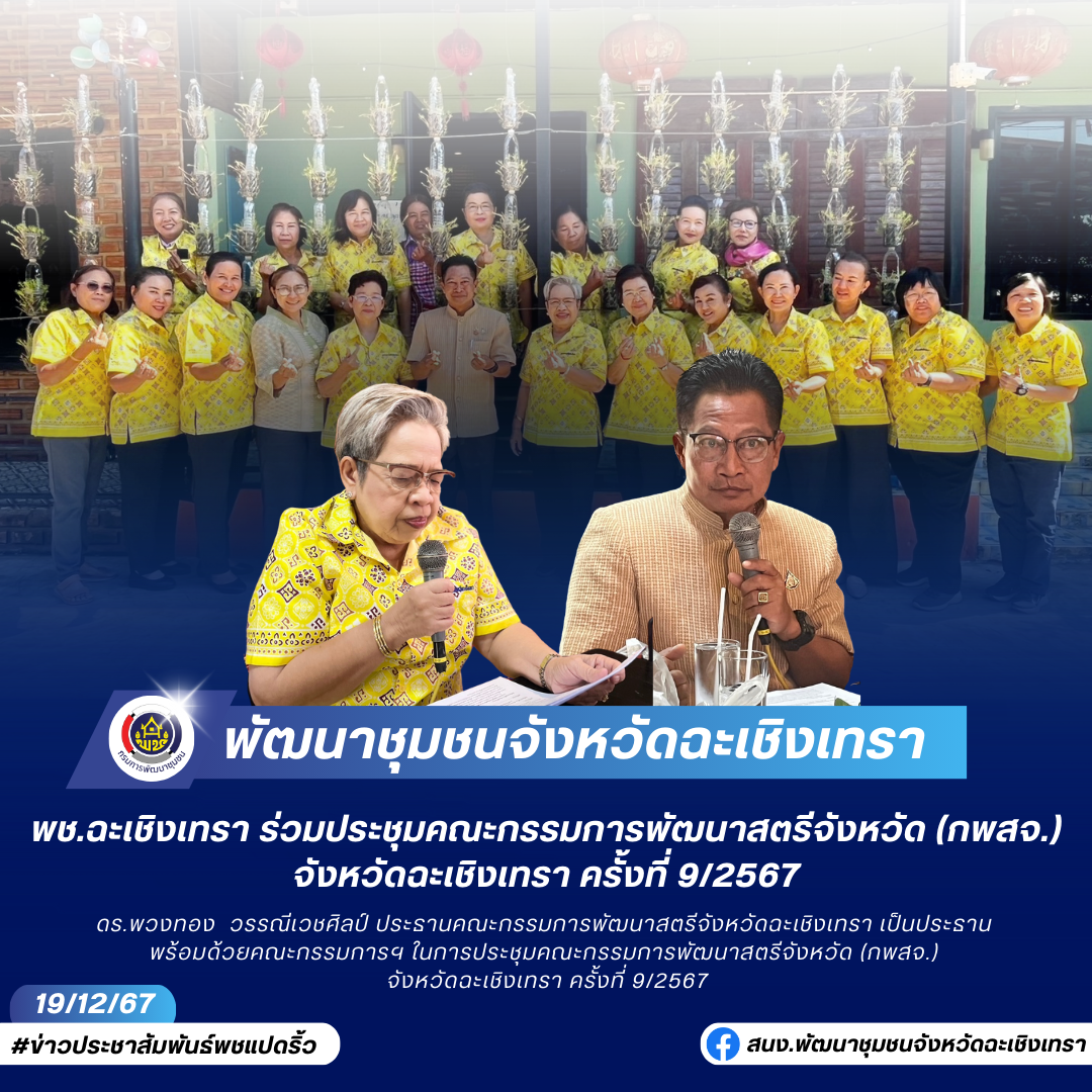 ดร.พวงทอง วรรณีเวชศิลป์ ประธานคณะกรรมการพัฒนาสตรีจังหวัดฉะเชิงเทรา เป็นประธาน พร้อมด้วยคณะกรรมการฯ ในการประชุมคณะกรรมการพัฒนาสตรีจังหวัด (กพสจ.) จังหวัดฉะเชิงเทรา ครั้งที่ 9/2567 โดยมีระเบียบวาระการประชุม ดังนี้