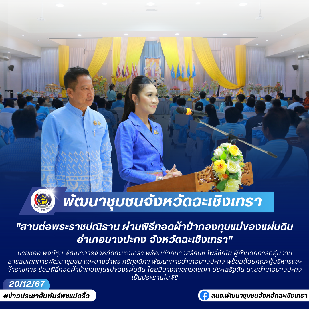 วันที่ 20 ธันวาคม 2567 บรรยากาศอันอบอุ่นและศักดิ์สิทธิ์ ณ หอประชุมอำเภอบางปะกง จังหวัดฉะเชิงเทรา นายชลอ พงษ์ชุบ พัฒนาการจังหวัดฉะเชิงเทรา พร้อมด้วยนางสรัลนุช โพธิ์ชัยโย ผู้อำนวยการกลุ่มงานสารสนเทศการพัฒนาชุมชน และนางอำพร ศรีกุลนิภา พัฒนาการอำเภอบางปะกง พร้อมด้วยคณะผู้บริหารและข้าราชการ ร่วมพิธีทอดผ้าป่ากองทุนแม่ของแผ่นดิน โดยมีนางสาวกมลชญา ประเสริฐสิน นายอำเภอบางปะกง เป็นประธานในพิธี