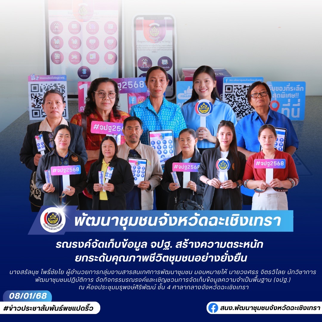 วันที่ 8 มกราคม 2568 นางสรัลนุช โพธิ์ชัยโย ผู้อำนวยการกลุ่มงานสารสนเทศการพัฒนาชุมชน มอบหมายให้ นายวงศธร จิตรวิไลย นักวิชาการพัฒนาชุมชนปฏิบัติการ จัดกิจกรรมรณรงค์และเชิญชวนการจัดเก็บข้อมูลความจำเป็นพื้นฐาน (จปฐ.) ณ ห้องประชุมมรุพงษ์ศิริพัฒน์ ชั้น 4 ศาลากลางจังหวัดฉะเชิงเทรา