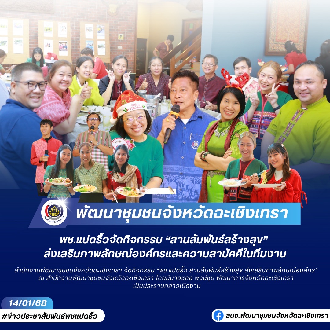 วันที่ 14 มกราคม 2568 สำนักงานพัฒนาชุมชนจังหวัดฉะเชิงเทรา จัดกิจกรรม “พช.แปดริ้ว สานสัมพันธ์สร้างสุข ส่งเสริมภาพลักษณ์องค์กร” ณ สำนักงานพัฒนาชุมชนจังหวัดฉะเชิงเทรา โดยมีนายชลอ พงษ์ชุบ พัฒนาการจังหวัดฉะเชิงเทรา เป็นประธานกล่าวเปิดงาน