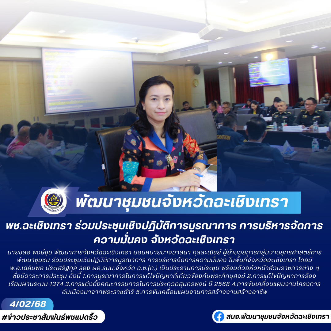 นายชลอ พงษ์ชุบ พัฒนาการจังหวัดฉะเชิงเทรา มอบหมายนางวาสนา กุลละณิชย์ ผู้อำนวยการกลุ่มงานยุทธศาสตร์การพัฒนาชุมชน ร่วมประชุมเชิงปฏิบัติการบูรณาการ การบริหารจัดการความมั่นคง ในพื้นที่จังหวัดฉะเชิงเทรา โดยมี พ.อ.เฉลิมพล ประเสริฐกุล รอง ผอ.รมน.จังหวัด ฉ.ช.(ท.) เป็นประธานการประชุม พร้อมด้วยหัวหน้าส่วนราชการต่าง ๆ ซึ่งมีวาระการประชุม ดังนี้