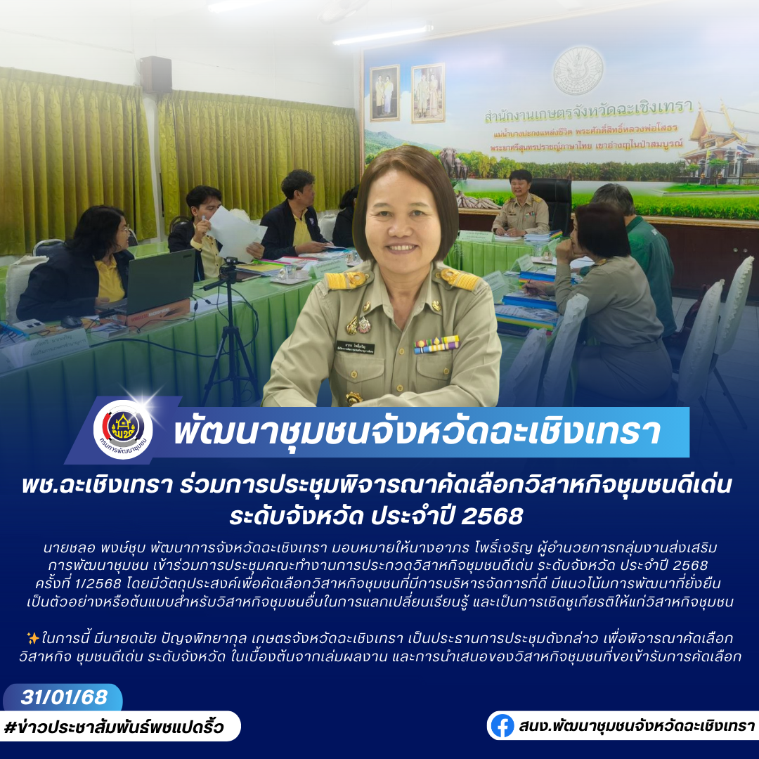 🤝พช.ฉะเชิงเทรา ร่วมการประชุมพิจารณาคัดเลือกวิสาหกิจชุมชนดีเด่น ระดับจังหวัด ประจำปี 2568