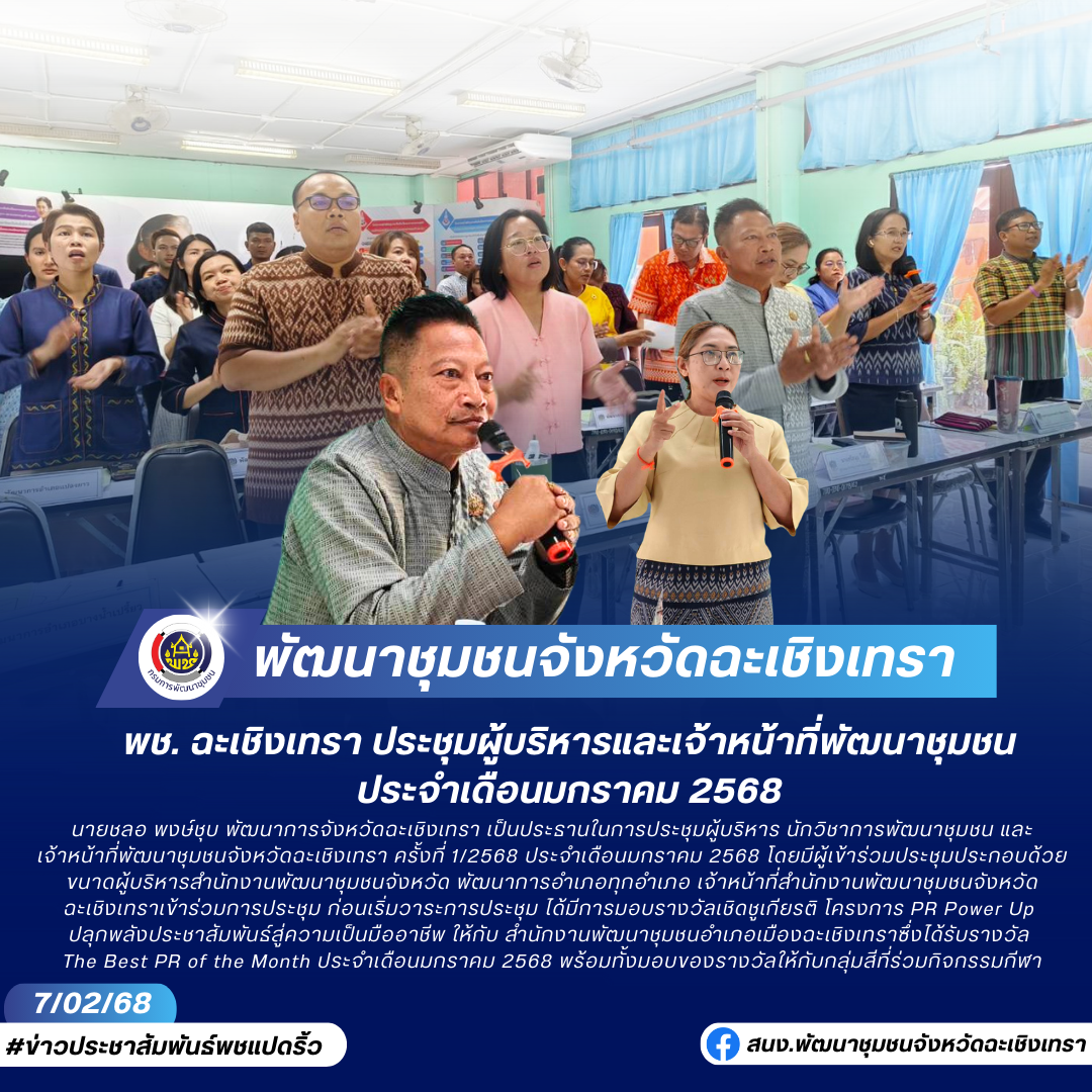 นายชลอ พงษ์ชุบ พัฒนาการจังหวัดฉะเชิงเทรา เป็นประธานในการประชุมผู้บริหาร นักวิชาการพัฒนาชุมชน และเจ้าหน้าที่พัฒนาชุมชนจังหวัดฉะเชิงเทรา ครั้งที่ 1/2568 ประจำเดือนมกราคม 2568 โดยมีผู้เข้าร่วมประชุมประกอบด้วย ขนาดผู้บริหารสำนักงานพัฒนาชุมชนจังหวัด พัฒนาการอำเภอทุกอำเภอ เจ้าหน้าที่สำนักงานพัฒนาชุมชนจังหวัดฉะเชิงเทราเข้าร่วมการประชุม ก่อนเริ่มวาระการประชุม ได้มีการมอบรางวัลเชิดชูเกียรติ โครงการ PR Power Up ปลุกพลังประชาสัมพันธ์สู่ความเป็นมืออาชีพ ให้กับ สำนักงานพัฒนาชุมชนอำเภอเมืองฉะเชิงเทราซึ่งได้รับรางวัล The Best PR of the Month ประจำเดือนมกราคม 2568 พร้อมทั้งมอบของรางวัลให้กับกลุ่มสีที่ร่วมกิจกรรมกีฬา