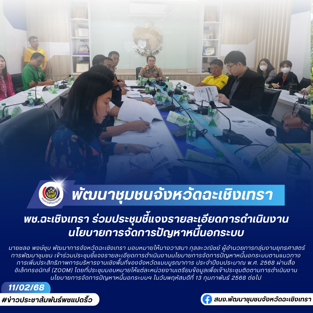 นายชลอ พงษ์ชุบ พัฒนาการจังหวัดฉะเชิงเทรา มอบหมายให้นางวาสนา กุลละวณิชย์ ผู้อำนวยการกลุ่มงานยุทธศาสตร์การพัฒนาชุมชน เข้าร่วมประชุมชี้แจงรายละเอียดการดำเนินงานนโยบายการจัดการปัญหาหนี้นอกระบบตามแนวทางการเพิ่มประสิทธิภาพการบริหารงานเชิงพื้นที่ของจังหวัดแบบบูรณาการ ประจำปีงบประมาณ พ.ศ. 2568 ผ่านสื่ออิเล็กทรอนิกส์ (ZOOM) โดยที่ประชุมมอบหมายให้แต่ละหน่วยงานเตรียมข้อมูลเพื่อเข้าประชุมติดตามการดำเนินงานนโยบายการจัดการปัญหาหนี้นอกระบบฯ ในวันพฤหัสบดีที่ 13 กุมภาพันธ์ 2568 ต่อไป