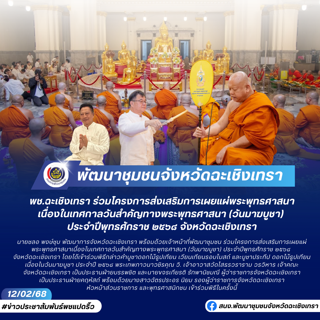 🍀☘️พช.ฉะเชิงเทรา ร่วมโครงการส่งเสริมการเผยแผ่พระพุทธศาสนาเนื่องในเทศกาลวันสำคัญทางพระพุทธศาสนา (วันมาฆบูชา) ประจำปีพุทธศักราช ๒๕๖๘ จังหวัดฉะเชิงเทรา
