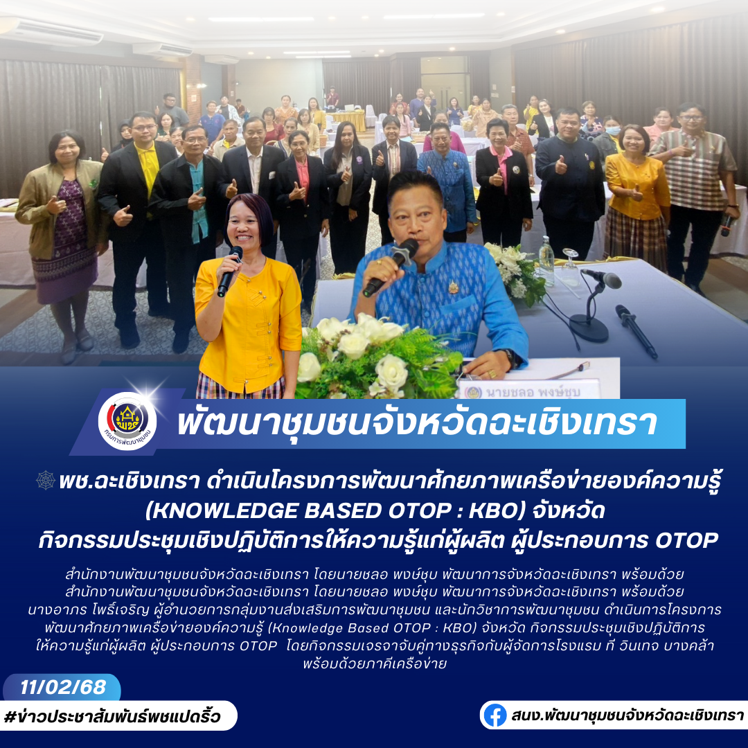 🕸️พช.ฉะเชิงเทรา ดำเนินโครงการพัฒนาศักยภาพเครือข่ายองค์ความรู้ (Knowledge Based OTOP : KBO) จังหวัด กิจกรรมประชุมเชิงปฏิบัติการให้ความรู้แก่ผู้ผลิต ผู้ประกอบการ OTOP