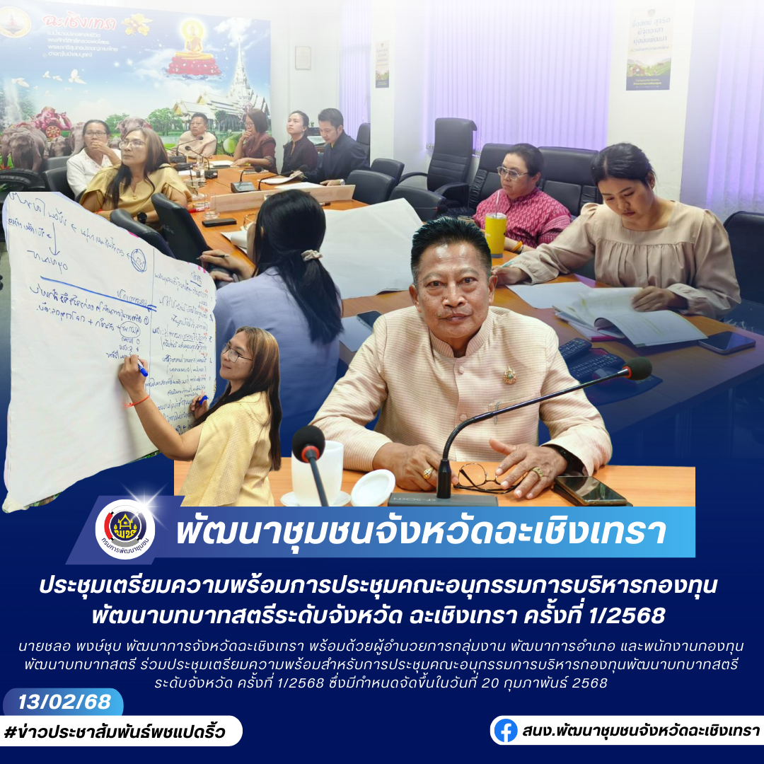 วันที่ 13 กุมภาพันธ์ 2568 นายชลอ พงษ์ชุบ พัฒนาการจังหวัดฉะเชิงเทรา พร้อมด้วยผู้อำนวยการกลุ่มงาน พัฒนาการอำเภอ และพนักงานกองทุนพัฒนาบทบาทสตรี ร่วมประชุมเตรียมความพร้อมสำหรับการประชุมคณะอนุกรรมการบริหารกองทุนพัฒนาบทบาทสตรีระดับจังหวัด ครั้งที่ 1/2568 ซึ่งมีกำหนดจัดขึ้นในวันที่ 20 กุมภาพันธ์ 2568