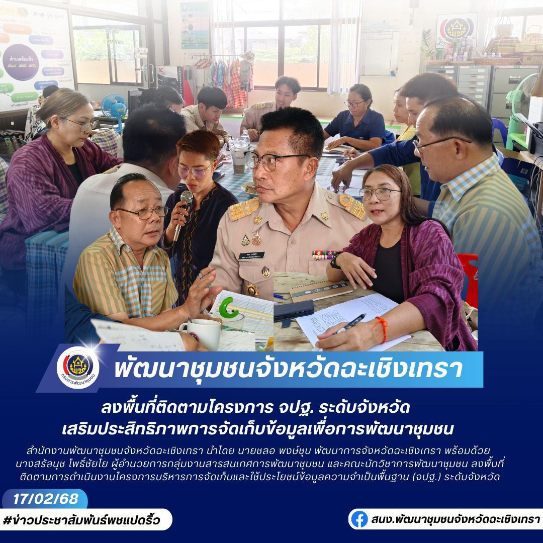 วันที่ 17 กุมภาพันธ์ 2568 — สำนักงานพัฒนาชุมชนจังหวัดฉะเชิงเทรา นำโดย นายชลอ พงษ์ชุบ พัฒนาการจังหวัดฉะเชิงเทรา พร้อมด้วย นางสรัลนุช โพธิ์ชัยโย ผู้อำนวยการกลุ่มงานสารสนเทศการพัฒนาชุมชน และคณะนักวิชาการพัฒนาชุมชน ลงพื้นที่ติดตามการดำเนินงานโครงการบริหารการจัดเก็บและใช้ประโยชน์ข้อมูลความจำเป็นพื้นฐาน (จปฐ.) ระดับจังหวัด