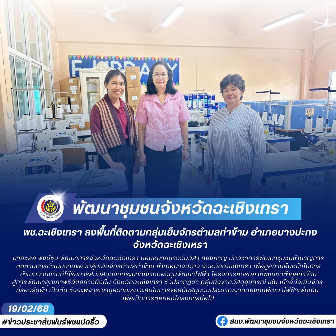นายชลอ พงษ์ชุบ พัฒนาการจังหวัดฉะเชิงเทรา มอบหมายนางวันวิสา ทองหาญ นักวิชาการพัฒนาชุมชนชำนาญการ ติดตามการดำเนินงานของกลุ่มเย็บจักรตำบลท่าข้าม อำเภอบางปะกง จังหวัดฉะเชิงเทรา เพื่อดูความคืบหน้าในการดำเนินงานจากที่ได้รับการสนับสนุนงบประมาณจากกองทุนพัฒนาไฟฟ้า โครงการอบรมอาชีพชุมชนตำบลท่าข้ามสู่การพัฒนาคุณภาพชีวิตอย่างยั่งยืน จังหวัดฉะเชิงเทรา ซึ่งปรากฎว่า กลุ่มยังขาดวัสดุอุปกรณ์ เช่น เก้าอี้นั่งเย็บจักร ที่รองรีดผ้า เป็นต้น ซึ่งจะพิจารณาดูความเหมาะสมในการขอสนับสนุนงบประมาณจากกองทุนพัฒนาไฟฟ้าเพิ่มเติม เพื่อเป็นการต่อยอดโครงการต่อไป