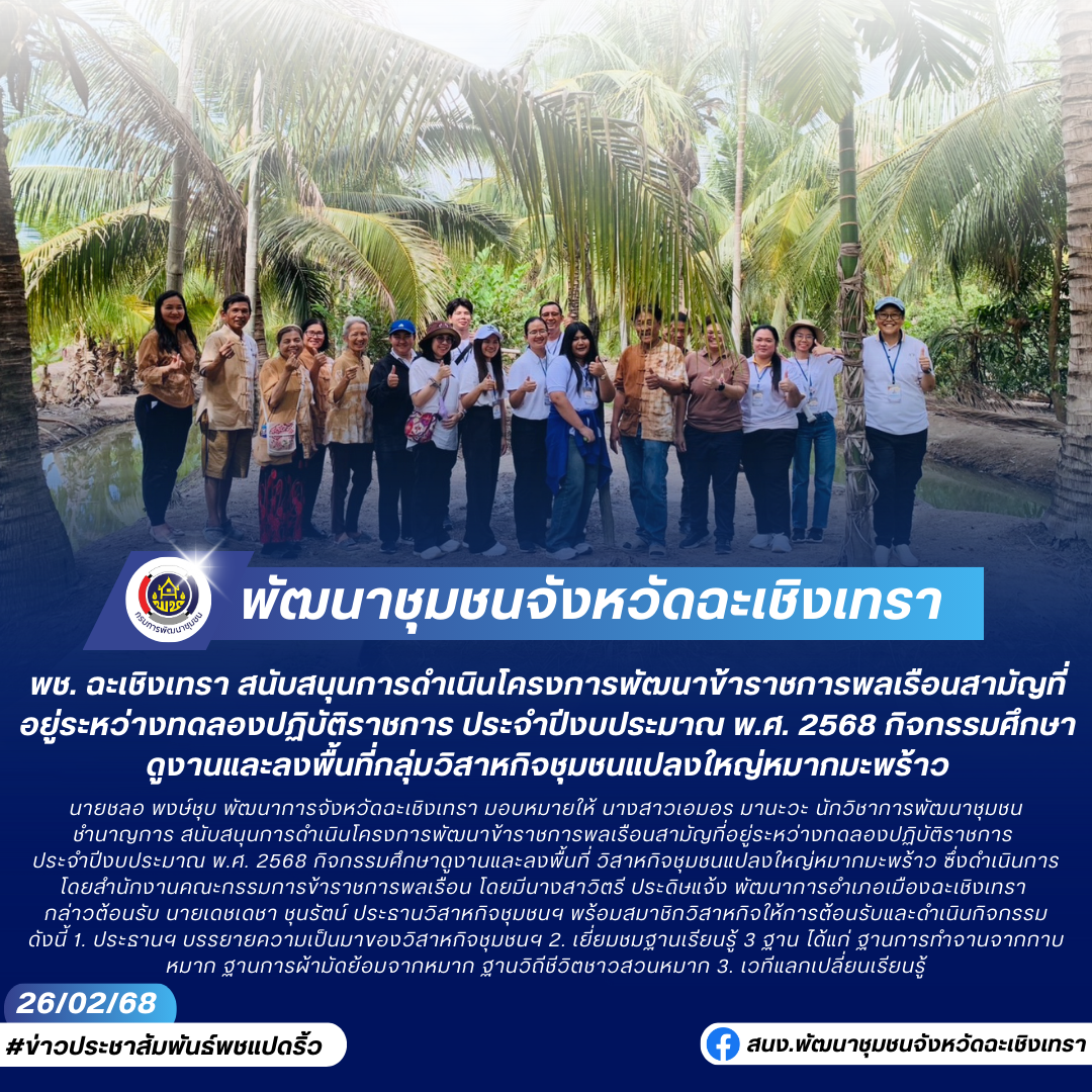 นายชลอ พงษ์ชุบ พัฒนาการจังหวัดฉะเชิงเทรา มอบหมายให้ นางสาวเอมอร มานะวะ นักวิชาการพัฒนาชุมชนชำนาญการ สนับสนุนการดำเนินโครงการพัฒนาข้าราชการพลเรือนสามัญที่อยู่ระหว่างทดลองปฏิบัติราชการ ประจำปีงบประมาณ พ.ศ. 2568 กิจกรรมศึกษาดูงานและลงพื้นที่ วิสาหกิจชุมชนแปลงใหญ่หมากมะพร้าว ซึ่งดำเนินการโดยสำนักงานคณะกรรมการข้าราชการพลเรือน โดยมีนางสาวิตรี ประดิษแจ้ง พัฒนาการอำเภอเมืองฉะเชิงเทรา กล่าวต้อนรับ นายเดชเดชา ชุนรัตน์ ประธานวิสาหกิจชุมชนฯ พร้อมสมาชิกวิสาหกิจให้การต้อนรับและดำเนินกิจกรรม ดังนี้