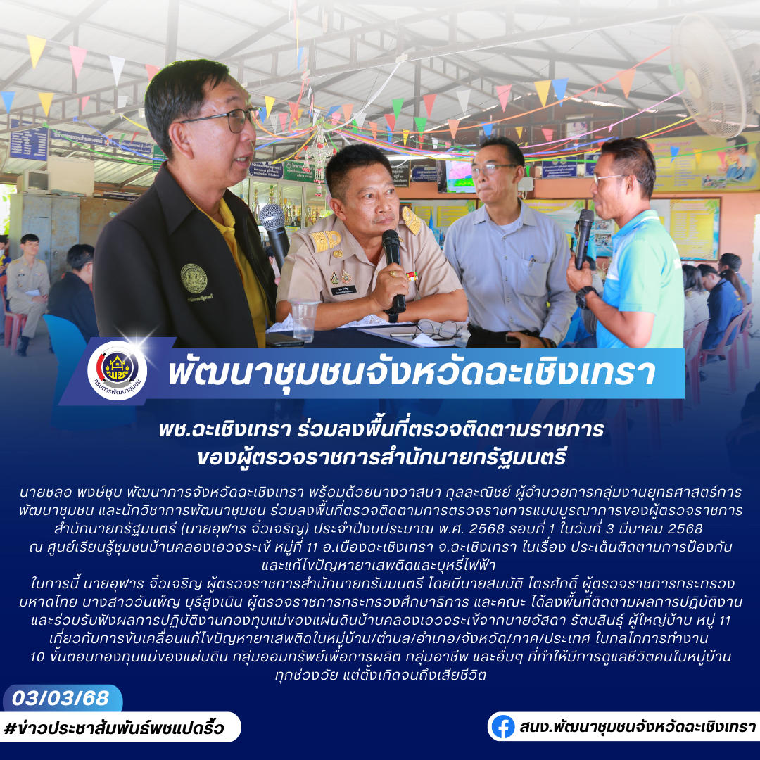 นายชลอ พงษ์ชุบ พัฒนาการจังหวัดฉะเชิงเทรา พร้อมด้วยนางวาสนา กุลละณิชย์ ผู้อำนวยการกลุ่มงานยุทธศาสตร์การพัฒนาชุมชน และนักวิชาการพัฒนาชุมชน ร่วมลงพื้นที่ตรวจติดตามการตรวจราชการแบบบูรณาการของผู้ตรวจราชการสำนักนายกรัฐมนตรี (นายอุฬาร จิ๋วเจริญ) ประจำปีงบประมาณ พ.ศ. 2568 รอบที่ 1 ในวันที่ 3 มีนาคม 2568 ณ ศูนย์เรียนรู้ชุมชนบ้านคลองเอวจระเข้ หมู่ที่ 11 อ.เมืองฉะเชิงเทรา จ.ฉะเชิงเทรา ในเรื่อง ประเด็นติดตามการป้องกันและแก้ไขปัญหายาเสพติดและบุหรี่ไฟฟ้า