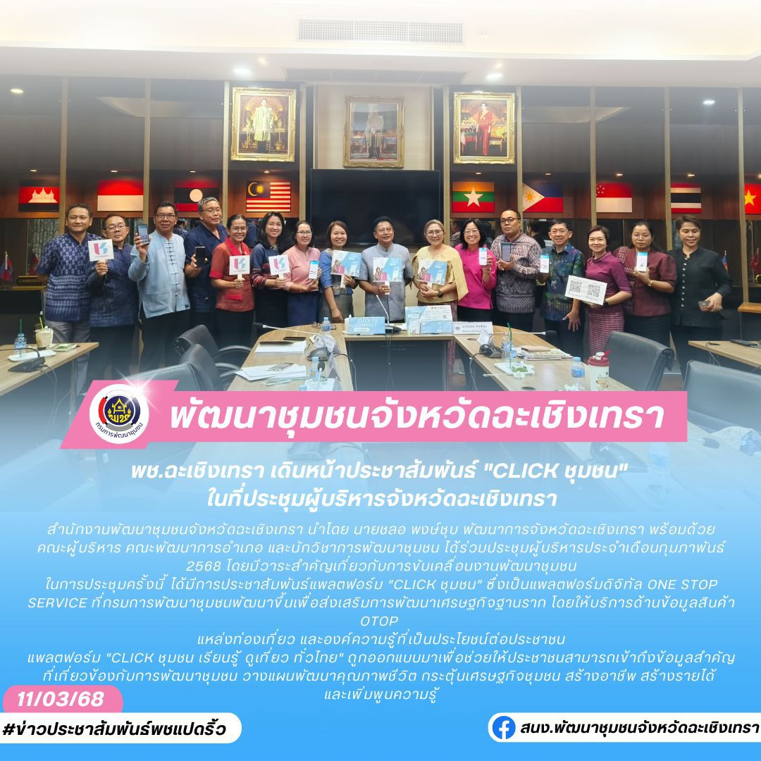 พช.ฉะเชิงเทรา เดินหน้าประชาสัมพันธ์ “Click ชุมชน” ในที่ประชุมผู้บริหารจังหวัดฉะเชิงเทรา