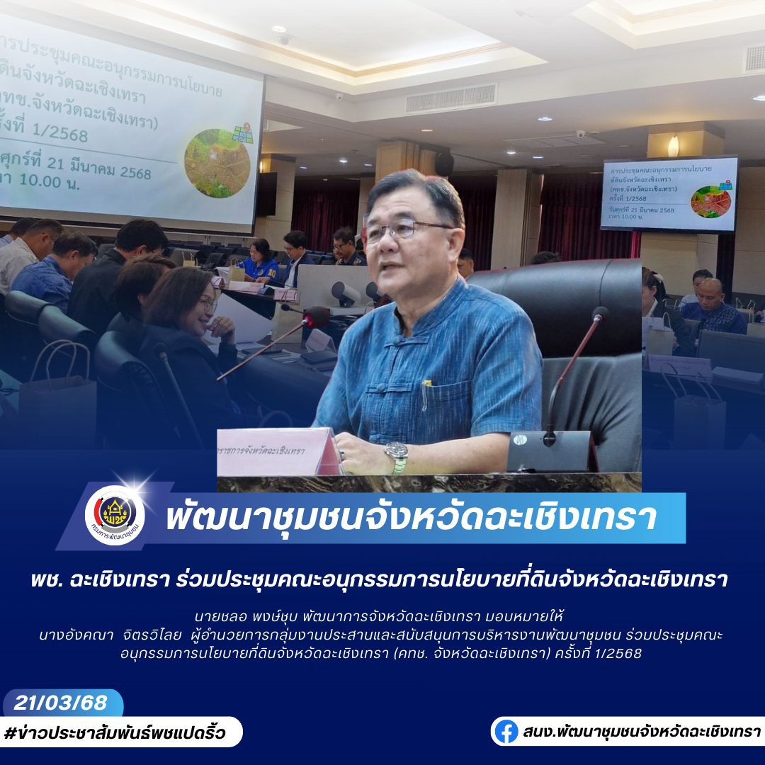 นางอังคณา จิตรวิไลย ผู้อำนวยการกลุ่มงานประสานและสนับสนุนการบริหารงานพัฒนาชุมชน ร่วมประชุมคณะอนุกรรมการนโยบายที่ดินจังหวัดฉะเชิงเทรา (คทช. จังหวัดฉะเชิงเทรา) ครั้งที่ 1/2568 วัตถุประสงค์ในการจัดประชุมครั้งนี้เพื่อขับเคลื่อนการบริหารจัดการที่ดินและทรัพยากรดินของจังหวัดฉะเชิงเทรา ให้เป็นไปตามระเบียบ กฎหมาย และนโยบายที่เกี่ยวข้อง โดยนายขจรเกียรติ รักพานิชมณี ผู้ว่าราชการจังหวัดฉะเเชิงทรา เป็นประธานในการประชุม ซึ่งมีวาระเพื่อพิจารณา ดังนี้ 1. การดำเนินการ กรณีแปลง คทช.มีการเปลี่ยนมือ โดยไม่เข้าหลักเกณฑ์ของ คทช. ที่ได้รับอนุญาตจากกรมป่าไม้แล้ว จำนวน 392 ไร่