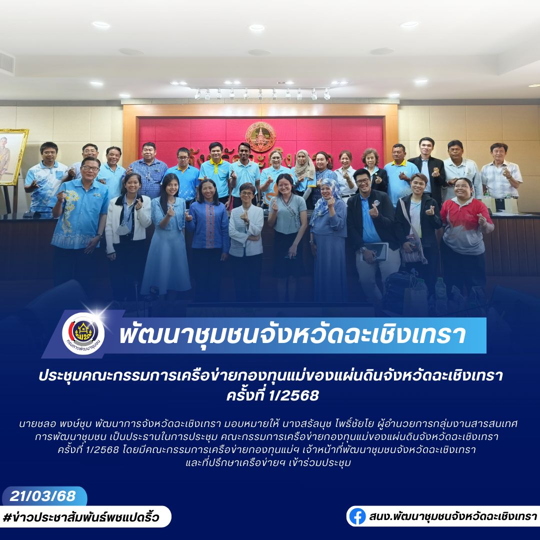 นายชลอ พงษ์ชุบ พัฒนาการจังหวัดฉะเชิงเทรา มอบหมายให้ นางสรัลนุช โพธิ์ชัยโย ผู้อำนวยการกลุ่มงานสารสนเทศการพัฒนาชุมชน เป็นประธานในการประชุม คณะกรรมการเครือข่ายกองทุนแม่ของแผ่นดินจังหวัดฉะเชิงเทรา ครั้งที่ 1/2568 โดยมีคณะกรรมการเครือข่ายกองทุนแม่ฯ เจ้าหน้าที่พัฒนาชุมชนจังหวัดฉะเชิงเทรา และที่ปรึกษาเครือข่ายฯ เข้าร่วมประชุม