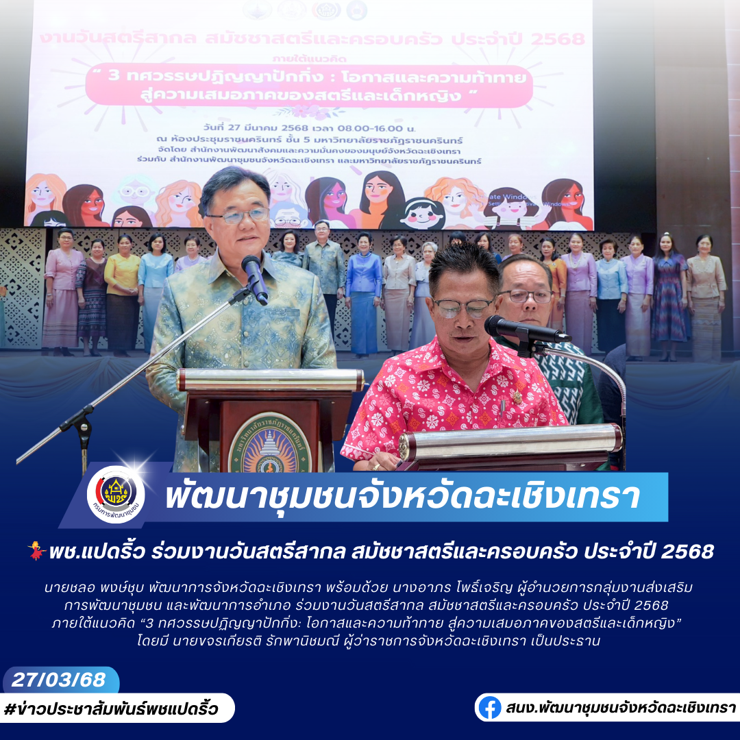 ✍🏻นายชลอ พงษ์ชุบ พัฒนาการจังหวัดฉะเชิงเทรา พร้อมด้วย นางอาภร โพธิ์เจริญ ผู้อำนวยการกลุ่มงานส่งเสริมการพัฒนาชุมชน และพัฒนาการอำเภอ ร่วมงานวันสตรีสากล สมัชชาสตรีและครอบครัว ประจำปี 2568 ภายใต้แนวคิด “3 ทศวรรษปฏิญญาปักกิ่ง: โอกาสและความท้าทาย สู่ความเสมอภาคของสตรีและเด็กหญิง” โดยมี นายขจรเกียรติ รักพานิชมณี ผู้ว่าราชการจังหวัดฉะเชิงเทรา เป็นประธาน