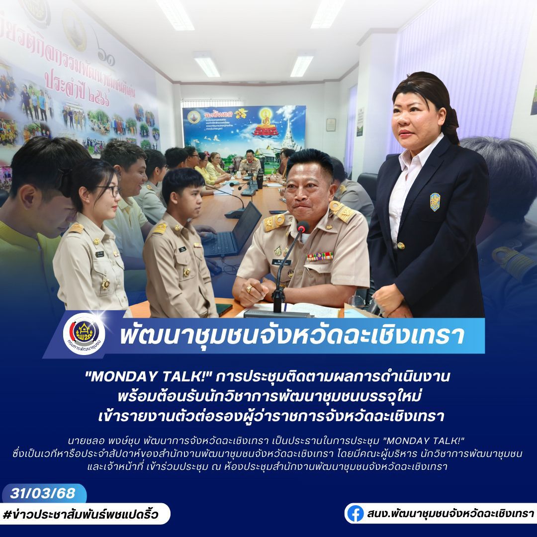 วันที่ 31 มีนาคม 2568 นายชลอ พงษ์ชุบ พัฒนาการจังหวัดฉะเชิงเทรา เป็นประธานในการประชุม “Monday Talk!” ซึ่งเป็นเวทีหารือประจำสัปดาห์ของสำนักงานพัฒนาชุมชนจังหวัดฉะเชิงเทรา โดยมีคณะผู้บริหาร นักวิชาการพัฒนาชุมชน และเจ้าหน้าที่ เข้าร่วมประชุม ณ ห้องประชุมสำนักงานพัฒนาชุมชนจังหวัดฉะเชิงเทรา