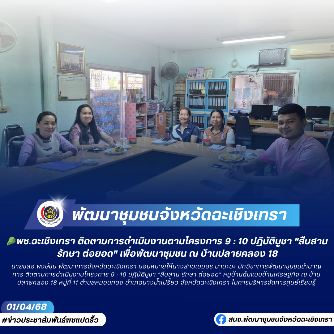 🥬พช.ฉะเชิงเทรา ติดตามการดำเนินงานตามโครงการ 9 : 10 ปฏิบัติบูชา “สืบสาน รักษา ต่อยอด” เพื่อพัฒนาชุมชน ณ บ้านปลายคลอง 18