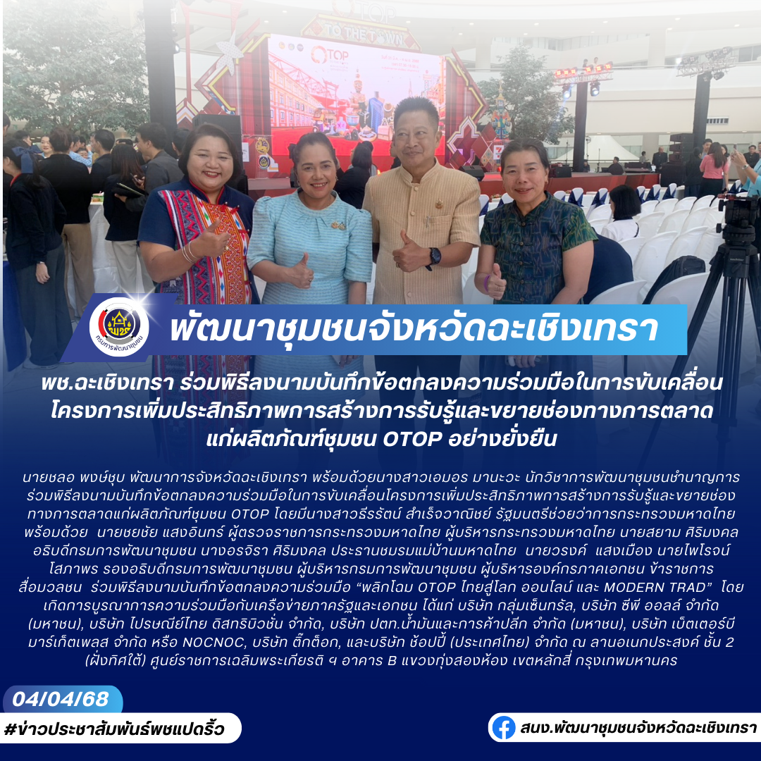 ✨นายชลอ พงษ์ชุบ พัฒนาการจังหวัดฉะเชิงเทรา พร้อมด้วยนางสาวเอมอร มานะวะ นักวิชาการพัฒนาชุมชนชำนาญการ ร่วมพิธีลงนามบันทึกข้อตกลงความร่วมมือในการขับเคลื่อนโครงการเพิ่มประสิทธิภาพการสร้างการรับรู้และขยายช่องทางการตลาดแก่ผลิตภัณฑ์ชุมชน OTOP โดยมีนางสาวธีรรัตน์ สำเร็จวาณิชย์ รัฐมนตรีช่วยว่าการกระทรวงมหาดไทย พร้อมด้วย นายชยชัย แสงอินทร์ ผู้ตรวจราชการกระทรวงมหาดไทย ผู้บริหารกระทรวงมหาดไทย นายสยาม ศิริมงคล อธิบดีกรมการพัฒนาชุมชน นางอรจิรา ศิริมงคล ประธานชมรมแม่บ้านมหาดไทย นายวรงค์ แสงเมือง นายไพโรจน์ โสภาพร รองอธิบดีกรมการพัฒนาชุมชน ผู้บริหารกรมการพัฒนาชุมชน ผู้บริหารองค์กรภาคเอกชน ข้าราชการ สื่อมวลชน ร่วมพิธีลงนามบันทึกข้อตกลงความร่วมมือ “พลิกโฉม OTOP ไทยสู่โลก ออนไลน์ และ Modern Trad” โดยเกิดการบูรณาการความร่วมมือกับเครือข่ายภาครัฐและเอกชน ได้แก่ บริษัท กลุ่มเซ็นทรัล, บริษัท ซีพี ออลล์ จำกัด (มหาชน), บริษัท ไปรษณีย์ไทย ดิสทริบิวชั่น จำกัด, บริษัท ปตท.น้ำมันและการค้าปลีก จำกัด (มหาชน), บริษัท เบ็ตเตอร์บี มาร์เก็ตเพลส จำกัด หรือ NocNoc, บริษัท ติ๊กต็อก, และบริษัท ช้อปปี้ (ประเทศไทย) จำกัด ณ ลานอเนกประสงค์ ชั้น 2 (ฝั่งทิศใต้) ศูนย์ราชการเฉลิมพระเกียรติ ฯ อาคาร B แขวงทุ่งสองห้อง เขตหลักสี่ กรุงเทพมหานคร