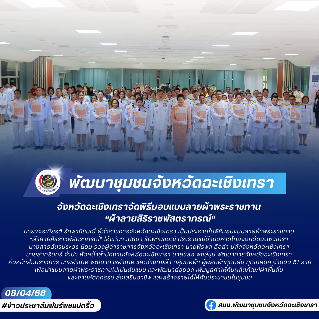 นายขจรเกียรติ รักพานิชมณี ผู้ว่าราชการจังหวัดฉะเชิงเทรา เป็นประธานในพิธีมอบแบบลายผ้าพระราชทาน “ผ้าลายสิริราชพัสตราภรณ์” ให้แก่นางปิติมา รักพานิชมณี ประธานแม่บ้านมหาดไทยจังหวัดฉะเชิงเทรา นางสาวฉัตรประอร นิยม รองผู้ว่าราชการจังหวัดฉะเชิงเทรา นายพีรพล ลือล่า ปลัดจังหวัดฉะเชิงเทรา นายสาครินทร์ จำปา หัวหน้าสำนักงานจังหวัดฉะเชิงเทรา นายชลอ พงษ์ชุบ พัฒนาการจังหวัดฉะเชิงเทรา หัวหน้าส่วนราชการ นายอำเภอ พัฒนาการอำเภอ และช่างทอผ้า กลุ่มทอผ้า ผู้ผลิตผ้าทุกกลุ่ม ทุกเทคนิค จำนวน 51 ราย เพื่อนำแบบลายผ้าพระราชทานไปเป็นต้นแบบ และพัฒนาต่อยอด เพิ่มมูลค่าให้กับผลิตภัณฑ์ผ้าพื้นถิ่น และงานหัตถกรรม ส่งเสริมอาชีพ และสร้างรายได้ให้กับประชาชนในชุมชน