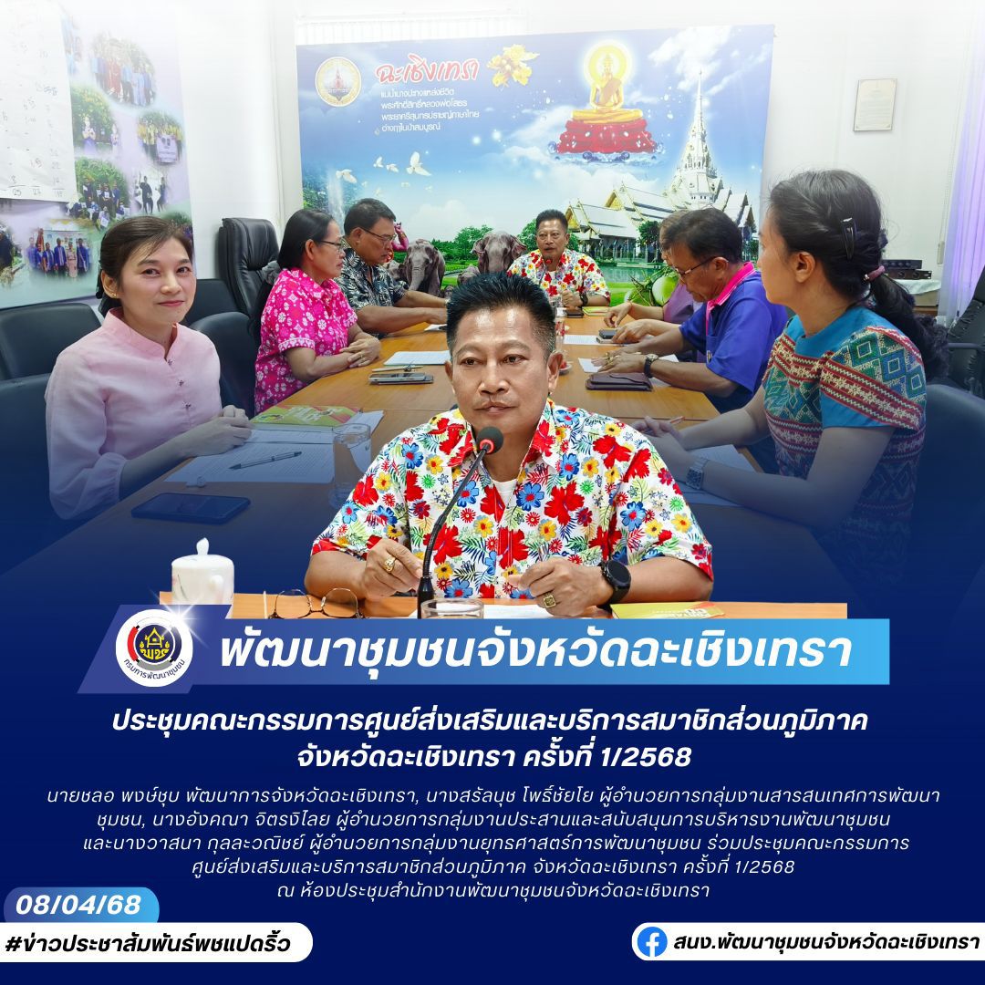 วันที่ 8 เมษายน 2568 นายชลอ พงษ์ชุบ พัฒนาการจังหวัดฉะเชิงเทรา, นางสรัลนุช โพธิ์ชัยโย ผู้อำนวยการกลุ่มงานสารสนเทศการพัฒนาชุมชน, นางอังคณา จิตรงิไลย ผู้อำนวยการกลุ่มงานประสานและสนับสนุนการบริหารงานพัฒนาชุมชน และนางวาสนา กุลละวณิชย์ ผู้อำนวยการกลุ่มงานยุทธศาสตร์การพัฒนาชุมชน ร่วมประชุมคณะกรรมการศูนย์ส่งเสริมและบริการสมาชิกส่วนภูมิภาค จังหวัดฉะเชิงเทรา ครั้งที่ 1/2568 ณ ห้องประชุมสำนักงานพัฒนาชุมชนจังหวัดฉะเชิงเทรา