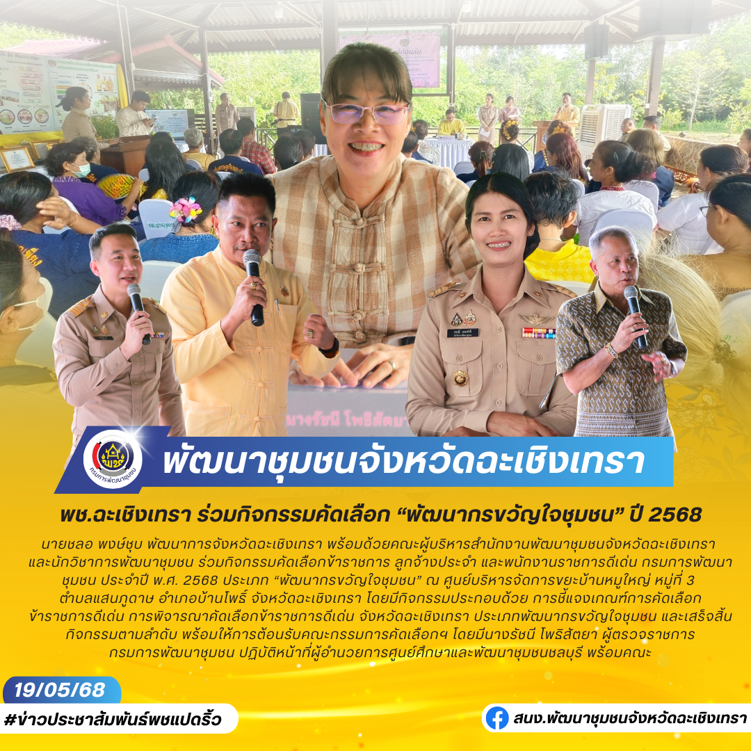 วันที่ 19 พฤษภาคม 2568 นายชลอ พงษ์ชุบ พัฒนาการจังหวัดฉะเชิงเทรา พร้อมด้วยคณะผู้บริหารสำนักงานพัฒนาชุมชนจังหวัดฉะเชิงเทรา และนักวิชาการพัฒนาชุมชน ร่วมกิจกรรมคัดเลือกข้าราชการ ลูกจ้างประจำ และพนักงานราชการดีเด่น กรมการพัฒนาชุมชน ประจำปี พ.ศ. 2568 ประเภท “พัฒนากรขวัญใจชุมชน” ณ ศูนย์บริหารจัดการขยะบ้านหมูใหญ่ หมู่ที่ 3 ตำบลแสนภูดาษ อำเภอบ้านโพธิ์ จังหวัดฉะเชิงเทรา โดยมีกิจกรรมประกอบด้วย การชี้แจงเกณฑ์การคัดเลือกข้าราชการดีเด่น การพิจารณาคัดเลือกข้าราชการดีเด่น จังหวัดฉะเชิงเทรา ประเภทพัฒนากรขวัญใจชุมชน และเสร็จสิ้นกิจกรรมตามลำดับ พร้อมให้การต้อนรับคณะกรรมการคัดเลือกฯ โดยมีนางรัชนี โพธิสัตยา ผู้ตรวจราชการกรมการพัฒนาชุมชน ปฏิบัติหน้าที่ผู้อำนวยการศูนย์ศึกษาและพัฒนาชุมชนชลบุรี พร้อมคณะ