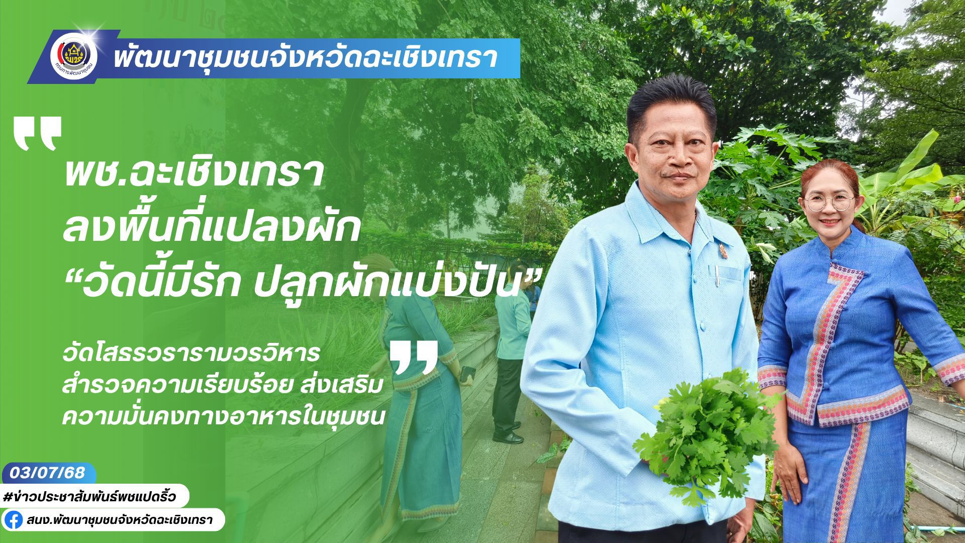 🌿 โครงการ “วัดนี้มีรัก ปลูกผักแบ่งปัน” เป็นกิจกรรมที่สำนักงานพัฒนาชุมชนจังหวัดฉะเชิงเทราร่วมกับวัดและภาคประชาชน ส่งเสริมให้วัดเป็นศูนย์กลางแห่งการเรียนรู้และเป็นแหล่งผลิตอาหารปลอดภัยแก่ชุมชนโดยรอบ มุ่งสร้างความมั่นคงทางอาหาร ลดรายจ่าย สร้างแหล่งอาหารพึ่งตนเอง และสร้างความสามัคคีในชุมชน