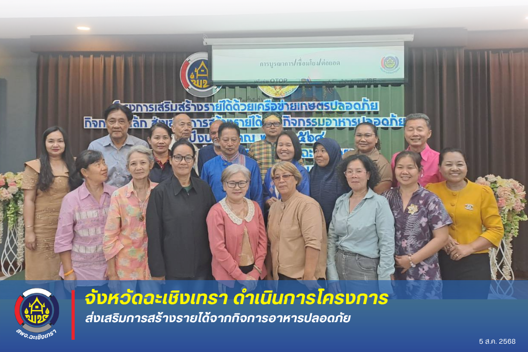 นายชลอ พงษ์ชุบ พัฒนาการจังหวัดฉะเชิงเทรา เป็นประธานเปิดโครงการส่งเสริมการสร้างรายได้จากกิจการอาหารปลอดภัย และเป็นวิทยากรบรรยาย การพัฒนาเศรษฐกิจฐานรากและประชารัฐสู่กิจการอาหารปลอดภัยจังหวัดฉะเชิงเทรา โดยมีวัตถุประสงค์ 1) เพื่อสร้างความรู้ความเข้าใจกลุ่มเป้าหมายในการสร้างรายได้กิจการอาหารปลอดภัย 2) เพื่อจัดทำแผนพัฒนา ต่อยอด และการเชื่อมโยงช่องทางการตลาดอาหารปลอดภัย 3) เพื่อเชื่อมโยงช่องทางการตลาดโดยบูรณาการความร่วมมือภาคเครือข่ายภาครัฐและภาคเอกชน โดยมีกลุ่มเป้าหมายเข้าร่วมโครงการฯ จำนวน 20 คน ประกอบด้วย กลุ่มเป้าหมายการพัฒนาเศรษฐกิจฐานรากและประชารัฐที่มีศักยภาพในการพัฒนาสินค้าสู่กิจการอาหารปลอดภัย 3 กลุ่มงาน ได้แก่ เกษตร แปรรูป ท่องเที่ยวโดยชุมชน ในพื้นที่จังหวัดฉะเชิงเทรา จำนวน 10 กลุ่ม ๆ ละ 2 คน รวม 20 คน ระหว่างวันที่ 5-6 สิงหาคม 2568 ณ ห้องบางปะกง โรงแรมที วินเทจ ตำบลท่าทองหลาง อำเภอบางคล้า จังหวัดฉะเชิงเทรา