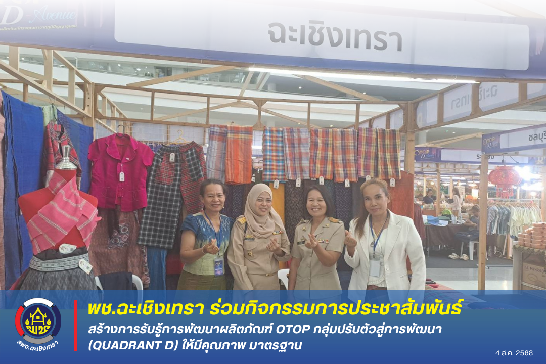 นายชลอ พงษ์ชุบ พัฒนาการจังหวัดฉะเชิงเทรา มอบหมายให้นางอาภร โพธิ์เจริญ ผู้อำนวยการกลุ่มงานส่งเสริมการพัฒนาชุมชน และเจ้าหน้าที่พัฒนาชุมชนจังหวัดฉะเชิงเทรา พบปะให้กำลังใจแก่ผู้ผลิต ผู้ประกอบการ OTOP ที่ร่วมกิจกรรมการประชาสัมพันธ์สร้างการรับรู้การพัฒนาผลิตภัณฑ์ OTOP กลุ่มปรับตัวสู่การพัฒนา (Quadrant D) ให้มีคุณภาพ มาตรฐาน โดยกิจกรรมภายในงานเป็นการจัดแสดงและจำหน่ายผลิตภัณฑ์ OTOP ที่ได้รับการพัฒนาตามโครงการพัฒนาผลิตภัณฑ์ OTOP กลุ่มปรับตัวสู่การพัฒนา (Quadrant D) ให้มีคุณภาพ มาตรฐาน จำนวน 25 ผลิตภัณฑ์ จากทั้ง 76 จังหวัดระหว่างวันที่ 4 – 8 สิงหาคม 2568 ณ ลานเอนกประสงค์ ชั้น 2 อาคารรัฐประศาสนภักดี (อาคาร B) ศูนย์ราชการเฉลิมพระเกียรติฯ แขวงทุ่งสองห้อง เขตหลักสี่ กรุงเทพฯ