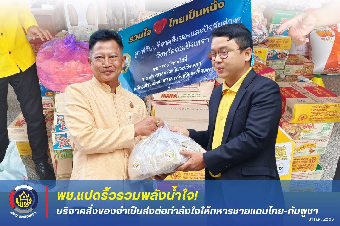 การบริจาคในครั้งนี้เป็นการร่วมแสดงพลังน้ำใจจากข้าราชการ เจ้าหน้าที่ และประชาชนจังหวัดฉะเชิงเทรา เพื่อส่งต่อไปยัง วัดโสธรวราราม วรวิหาร ซึ่งเป็นจุดรวมสิ่งของก่อนนำส่งต่อไปยังเจ้าหน้าที่ทหารที่ปฏิบัติหน้าที่ในพื้นที่ชายแดนไทย – กัมพูชา