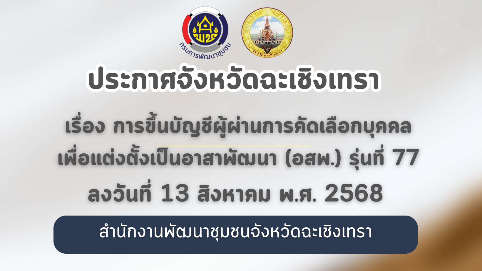 ประกาศจังหวัดฉะเชิงเทรา ลงวันที่ 13 สิงหาคม 2568 เรื่อง การขึ้นบัญชีผู้ผ่านการคัดเลือกบุคคลเพื่อแต่งตั้งเป็นอาสาพัฒนา (อสพ.) รุ่นที่ 77